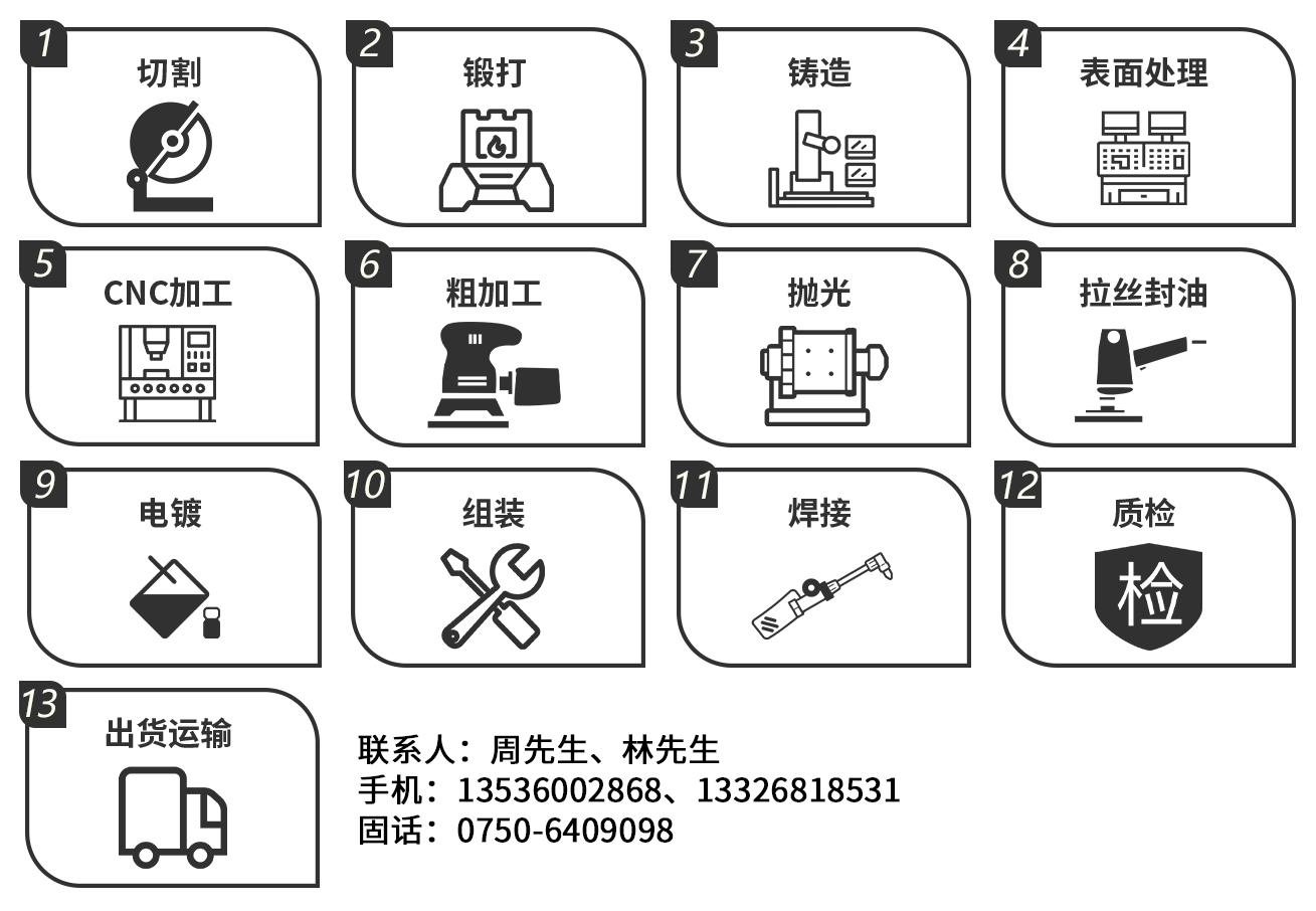 二十多年行業技術的累積與沉淀,工廠不斷發展整合升級,我司已經有擁有了鍛打車間、CNC車間、粗加工車間、QC實驗室。工廠配備:①主要生產設備:5臺四軸加工中心、CNC 精密數控車床100臺、自動液壓床 10 臺及 PVD 鍍膜機 2 臺等設備;②主要檢測儀器:光譜儀、二次元投影儀、扭力測試機、膜厚測試儀、鹽霧測試機等。我們根據不同